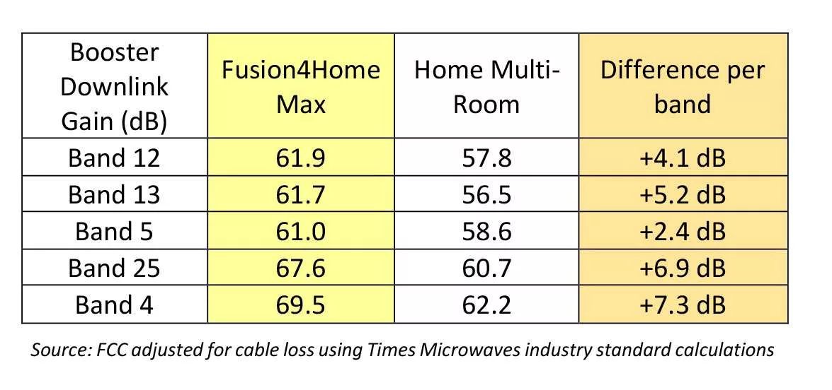 Fusion4Home Max outperforms the Multi-Room (when adjusted for cable loss) by delivering up to +7 dB higher downlink gain and a higher signal-to-noise ratio (SINR). Fusion4Home Max also features the SureCall’s patented 2XP technology, which doubles uplink transmission power to cell towers to help users stay connected in even the most remote and signal deprived locations.